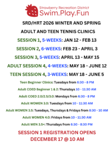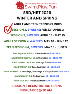 Strawberry Recreation District is pleased to announce adult and teen tennis clinics with HRT. Clinics will be offered in 4 – 6 week sessions. Based on demand, classes may vary from session to session.